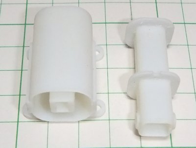 | 出来上がってきたパーツ。 一部(ボビンのエナメル線出口)が壊れていた。 ホワイトアクリルは脆いらしく その後コイルを巻いている時にもボビンの端がもげた。 |